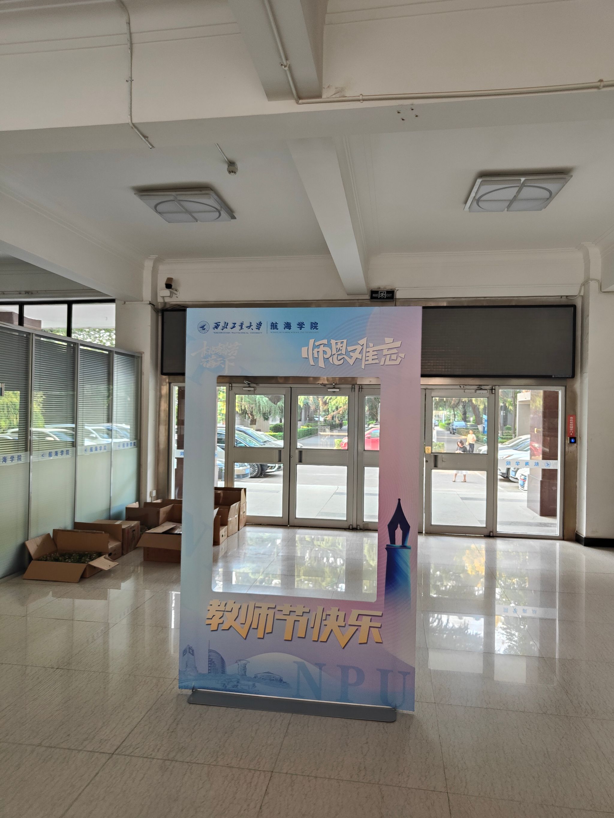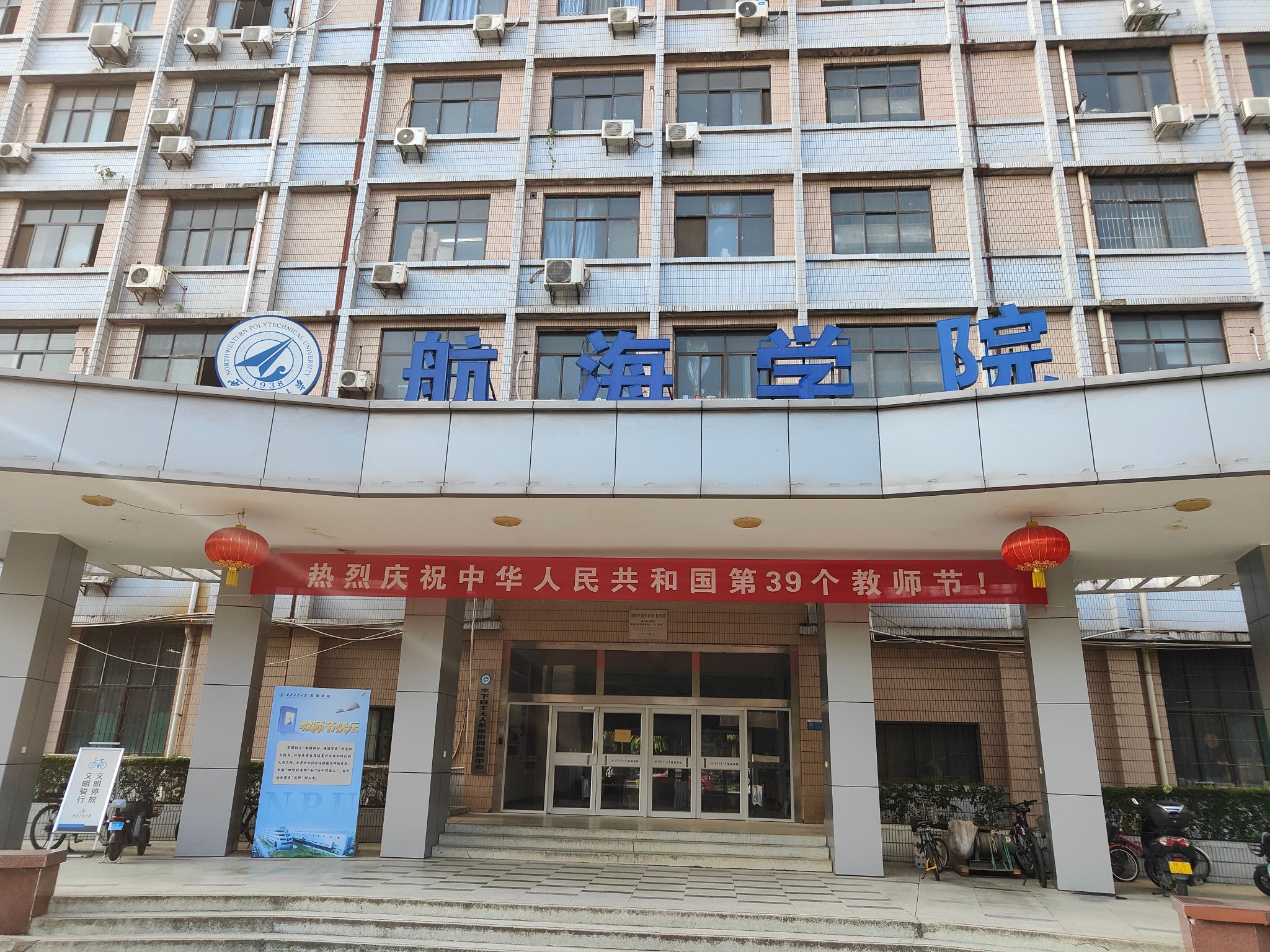9月8日至10日在友谊校区萝莉岛办公楼前悬挂“热烈庆祝中华人民共和国第三十九个教师节”横幅,并摆放“师恩难忘”等标语师生合影背景墙。
