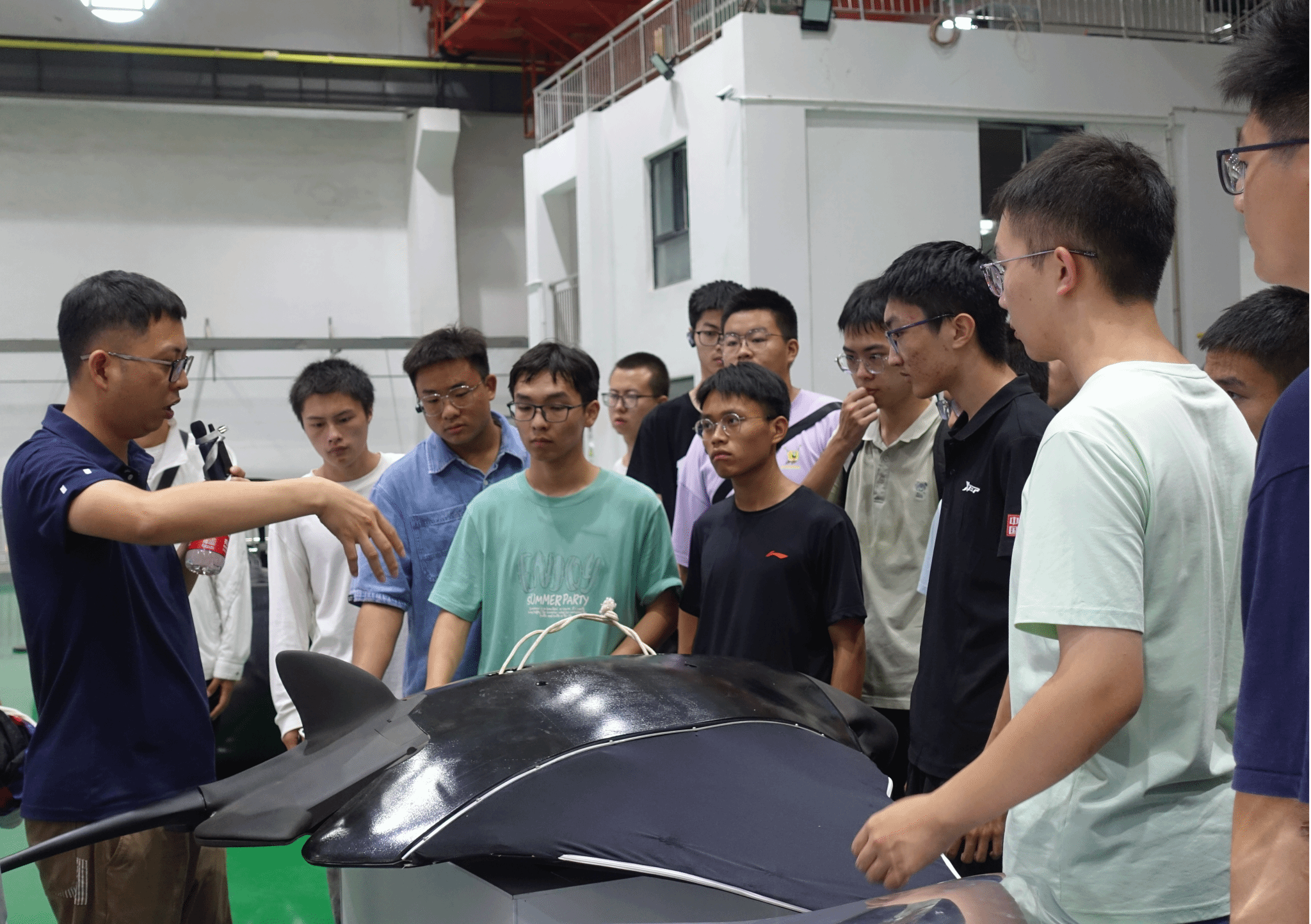 随后,围绕实验室的设备设施和产品两方面展开学习和参观。设备设施方面,叶老师以深海中“压力”和“通信”两大问题引入,带领学生先后参观高压釜试验系统和水下发射系统试验平台,对其工作原理作了深入浅出地介绍。产品方面,为学生展示并科普实验室研制的无人自主水下航行器、新型水下滑翔机、仿生柔体潜水器等性能先进的水下无人装备。以上产品均以各自优越性见长,为海洋工程装备跨越式发展,为无人水下运载技术的发展以及学校萝莉岛“双一流”建设做出了突出贡献。