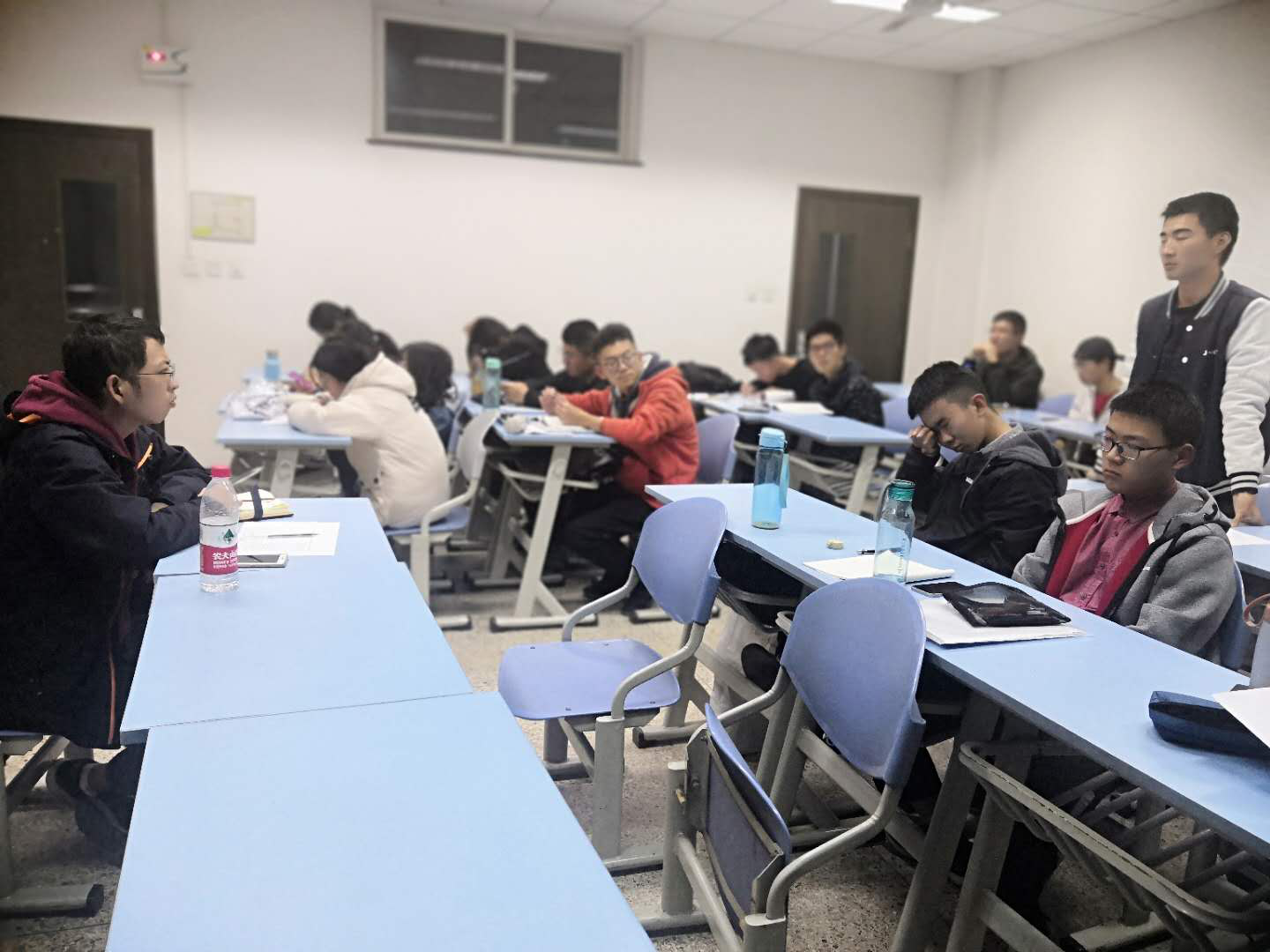 各班班主任对本班学生的学习状况倍加关心,对本班学生常常进行当面和线上督促。在数学模拟考试结束之后,许多班级班主任来到新校区召开班会,点评前一阶段学习和考试情况,表扬优异同学、鼓励落后同学,提高学生对与学习的热情和积极性。对于不及格的同学以及徘徊在及格边缘的同学,辅导员采用面谈的方法对他们进行一对一谈心,着力于解决他们对于学习的迷茫以及对大学学习的不适应性,从而提高他们的成绩,为期末考试努力实现“零挂科”奠定基础。各班结合自身情况开展学习活动,由成绩优异、基础扎实的同学为学习成绩较差、基础较为落后的同学提供学习意见、传授学习经验,形成了“互帮互助”的优良学风和“团结友爱”的班风,各班的学习状态以及班级凝聚力都显著提高。