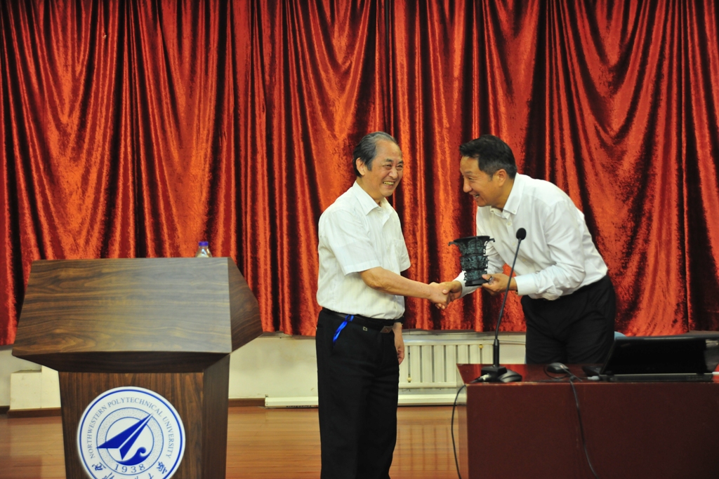 全体师生向王田苗教授赠送学校纪念品“何尊”,并感慨道“作为一名老师,很欣慰看到自己的学生在科研工作的传承和发扬”。马院士就报告内容临场题词“近看小山大,远看大山小,从近走到远,目光步步高”,希望王田苗教授常回母校看看,多为师生做做报告,也希望在座的师生可以做出更有广度,更有高度,更有深度的科研工作。